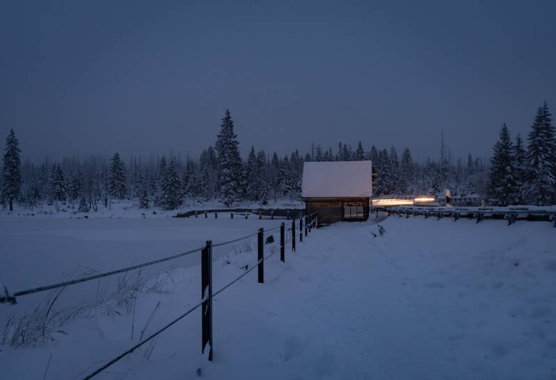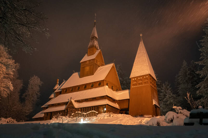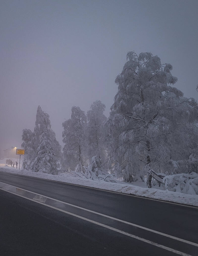 Natürlich vorbei an Torfhaus mit dem neuen Turm, den wir im Nebel kaum erkennen, danach machen wir zur blauen Stunde Halt am Oderteich und in kompletter Dunkelheit in Hahnenklee an der Stabkirche.