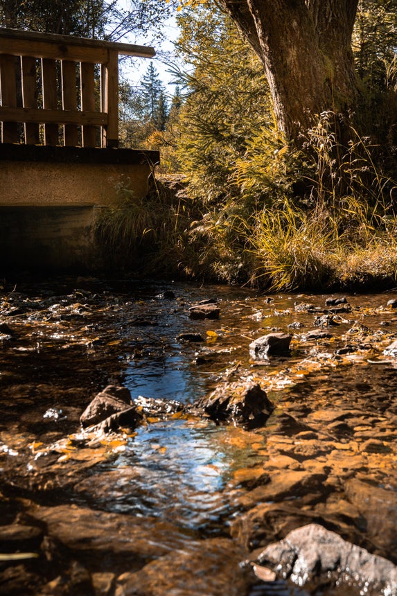 Über eine kleine Brücke geht es bergauf am Silberteich und einem Teil des Naturmythenpfads entlang. Hier gibt es einiges zu entdecken!