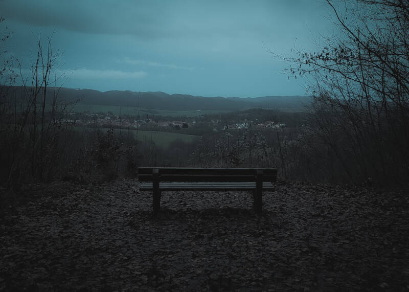 Wir gehen weiter Richtung Stempelstelle „Hexentanzplatz Ellricher Blick – HWN167" und genießen noch kurz von der Bank aus den Blick auf das in der Dämmerung liegende Ellrich.