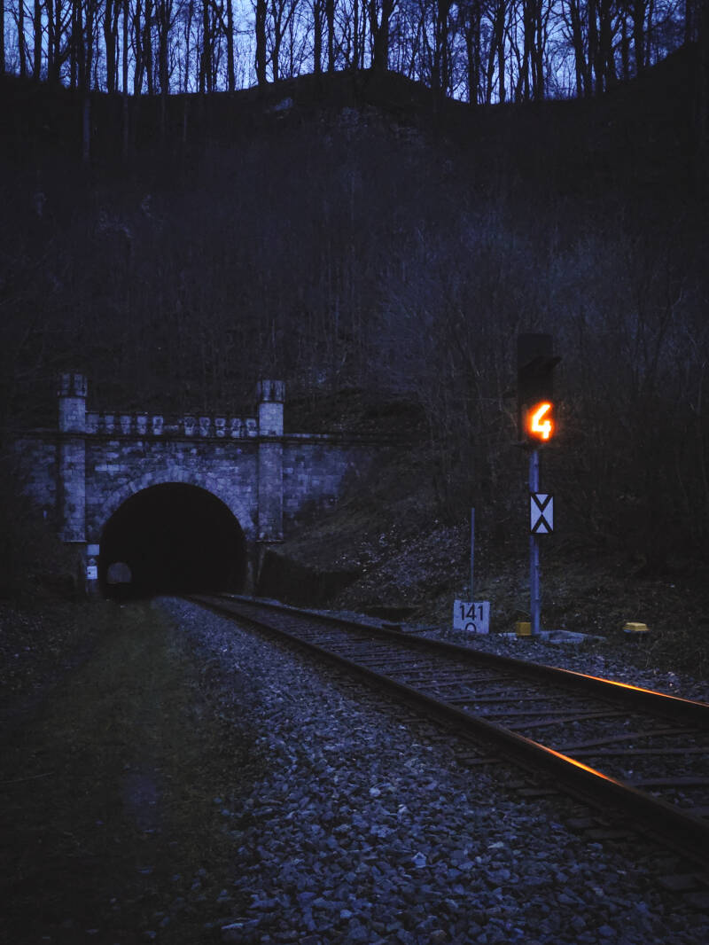 Wir machen noch einen Umweg zum Portal des Himmelreichtunnels, welches man im damals typischen Stil des Historismus burgähnlich mit Zinnen gestaltete.